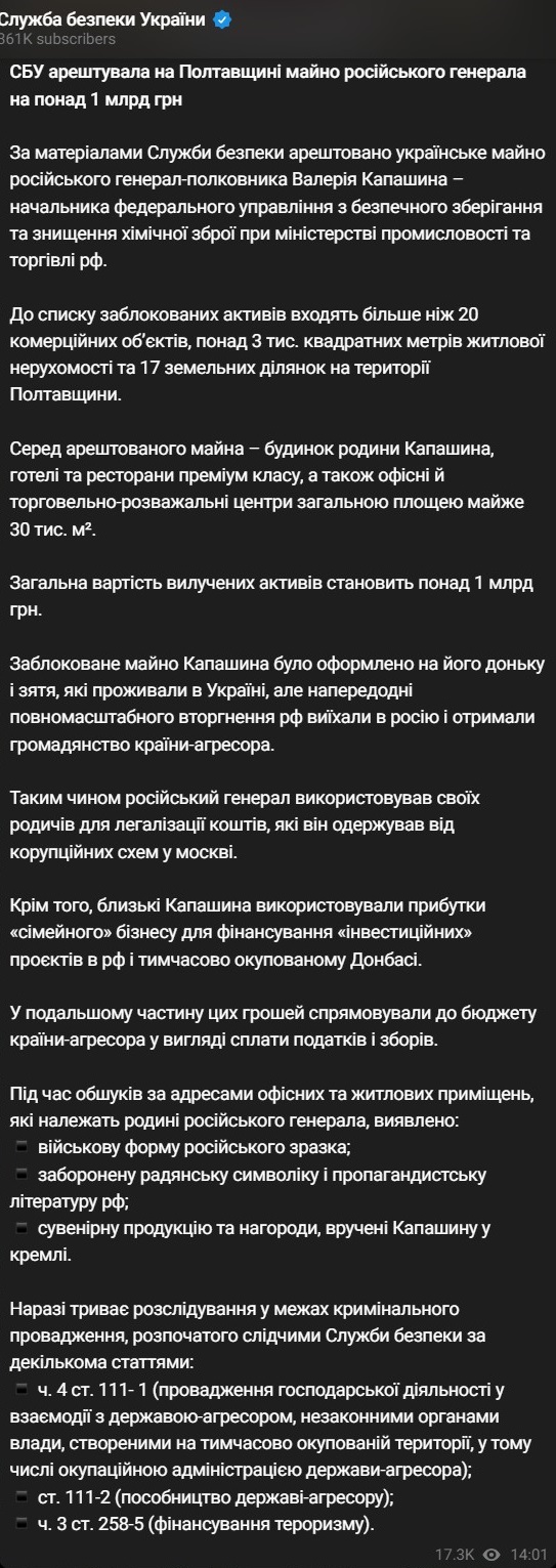 В Полтавській області заарештовано майно доньки та зятя російського генерала на понад мільярд гривень. За даними СБУ, це майно російського генерал-полковника Валерія Капашина, а на його родину воно просто оформлене з метою легалізації.