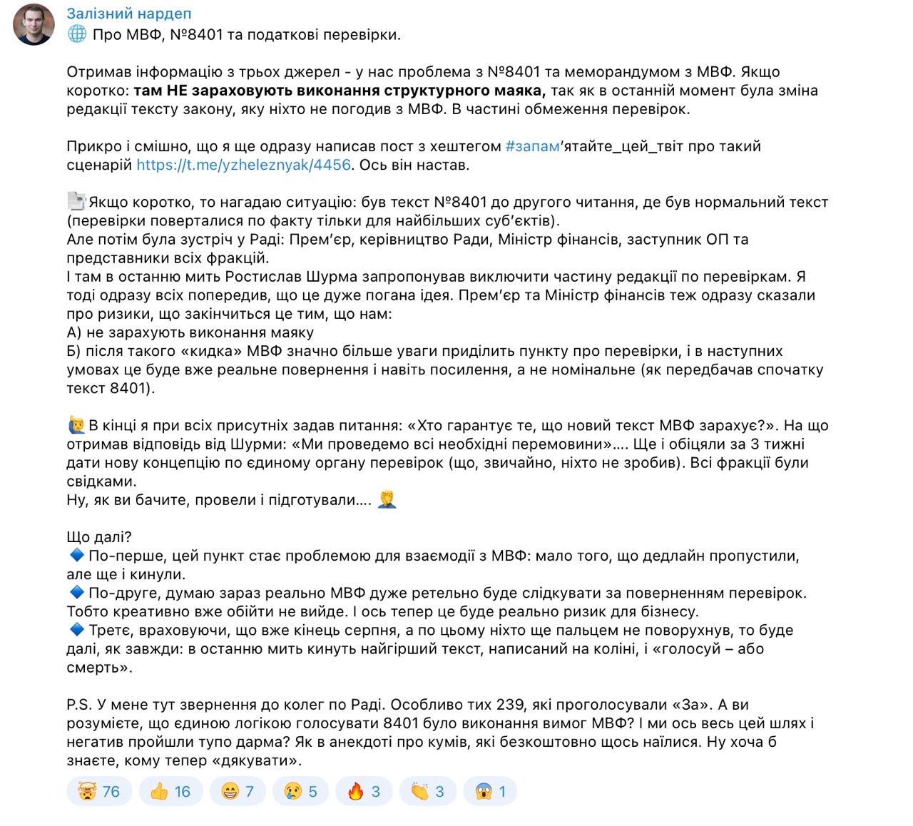 "Якщо коротко: там (у МВФ – Ред.) не зараховують виконання структурного маяка, оскільки в останній момент була зміна редакції тексту закону, яку ніхто не погодив із МВФ. У частині обмеження перевірок", - пише нардеп.