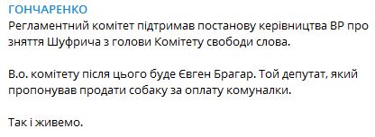 При цьому Шуфрич залишиться членом комітету, оскільки без нього там залишалося б лише дві людини, а потрібно як мінімум три для існування парламентського комітету.