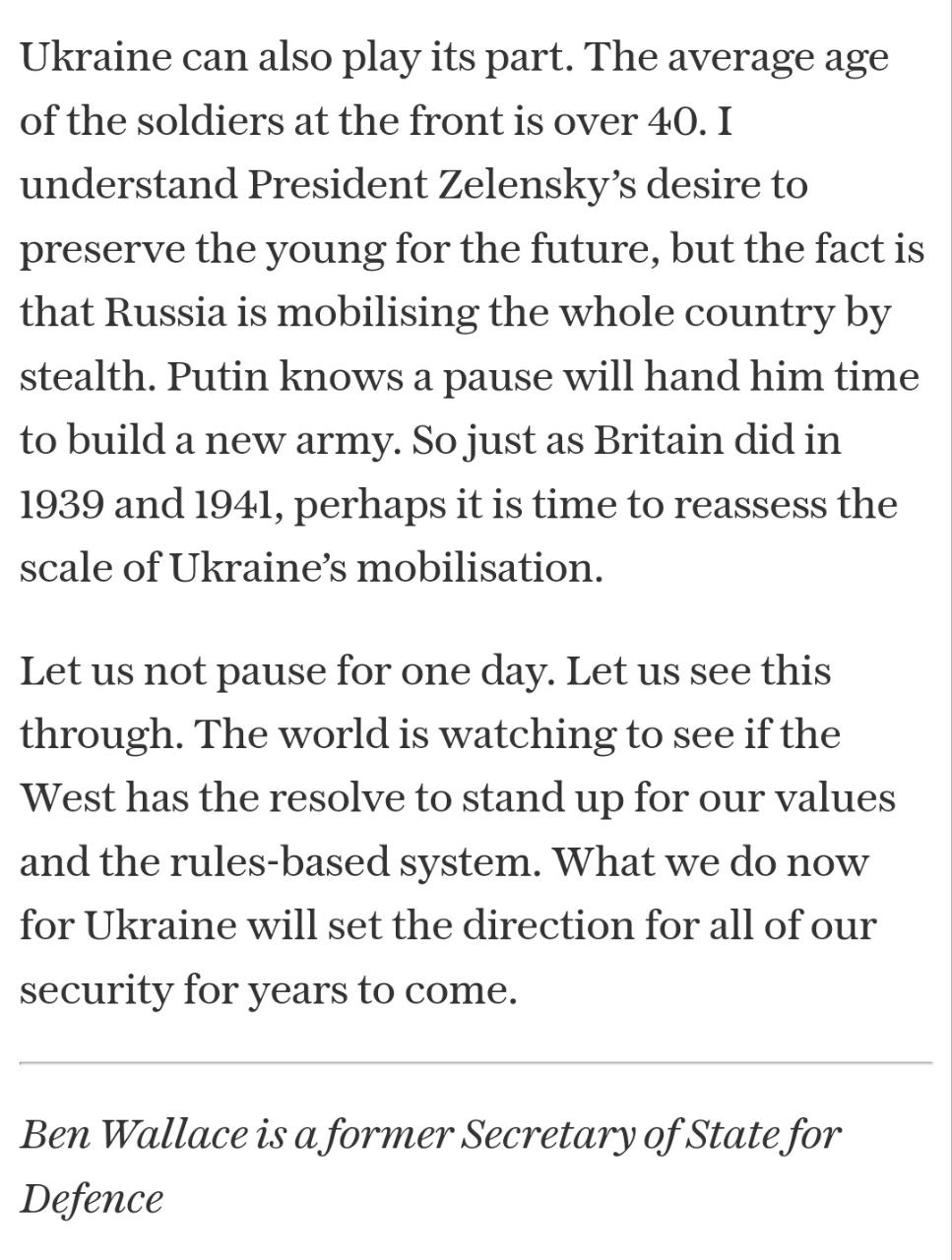 "Середній вік солдатів на фронті - за 40. Я розумію прагнення президента Зеленського зберегти молодь для майбутнього, але правда в тому, що Росія потай мобілізує всю країну. Так що, як це зробила Великобританія в 1939 і 1941 роках, можливо, настав час переоцінити масштаби української мобілізації", - заявив Уоллес.
