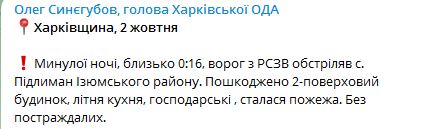 08.22 Минулої ночі, близько 00:16, ворог із РСЗВ обстріляв с. Підлиман Ізюмського району. Пошкоджено 2-поверховий будинок, літня кухня, господарські, сталася пожежа. Обійшлося без постраждалих.