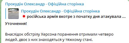 11:05 У Херсонській ОВА уточнюють. що внаслідок ранкового обстрілу поранено четверо людей. Двоє перебувають у тяжкому стані.