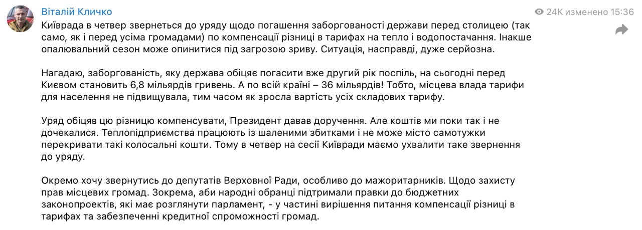 "А якщо ні, то опалювальний сезон може опинитися під загрозою зриву. Ситуація насправді дуже серйозна", - зазначив Кличко.