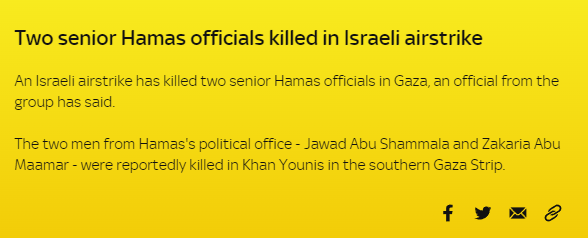 Внаслідок повітряного удару, проведеного Армією оборони Ізраїлю в секторі Газа, було ліквідовано двох високопосадовців ХАМАС: "міністр економіки" Джавад Абу Шамал і член політбюро ХАМАС Закарія Абу Маамара.