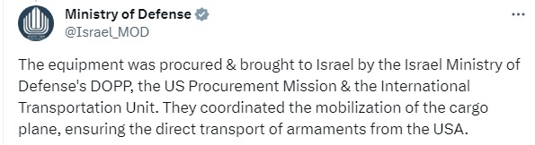 "Обладнання було закуплено та доставлено до Ізраїлю відділом міністерства оборони Ізраїлю, місією із закупівель США та відділом міжнародних перевезень. Вони координували прибуття вантажного літака, забезпечуючи пряме транспортування озброєння зі США", - сказано в пості.