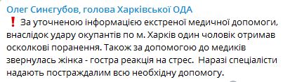 07.35 Вчора пізно ввечері внаслідок удару по Харкову одна людина отримала осколкові поранення. Також по допомогу до медиків звернулася жінка – у неї гостра реакція на стрес.