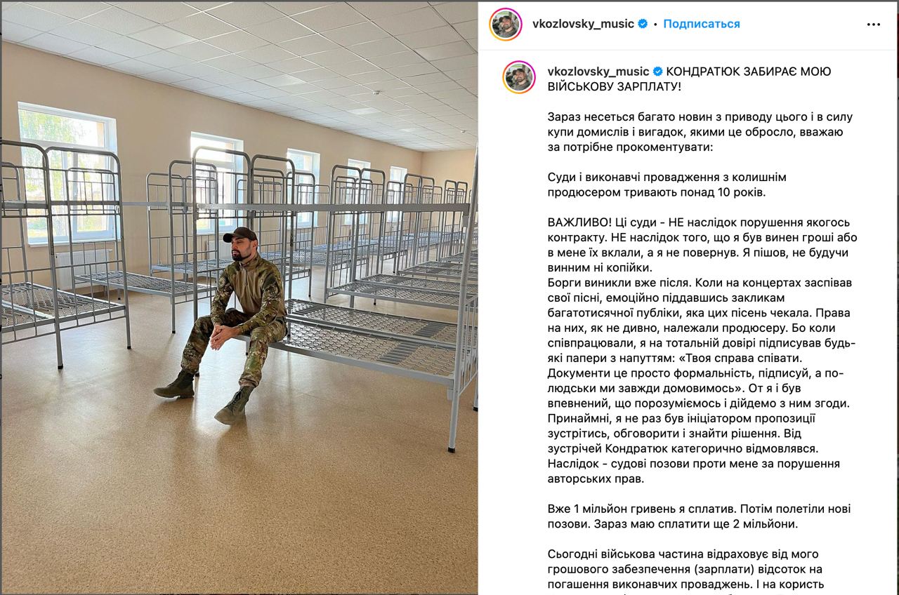 Співак Віталій Козловський, який служить у ЗСУ, заявив, що його колишній продюсер Ігор Кондратюк забирає у нього зарплату військового.
