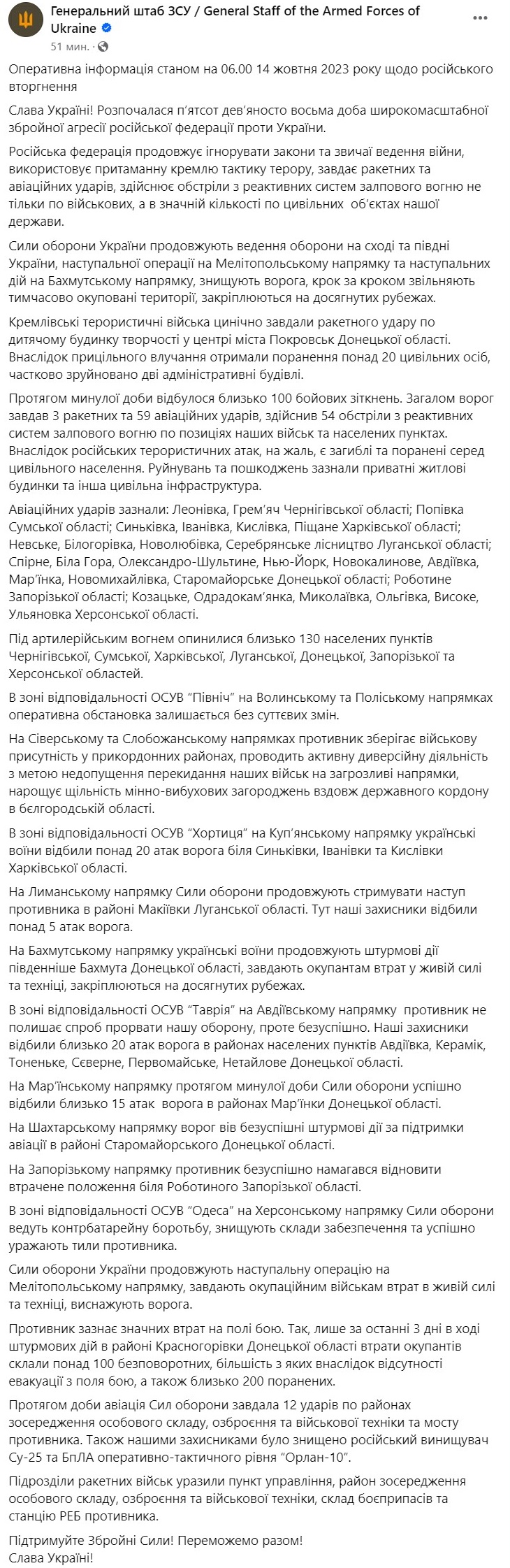 У суботу, 14 жовтня, в Україні триває 598-й день війни з Росією.