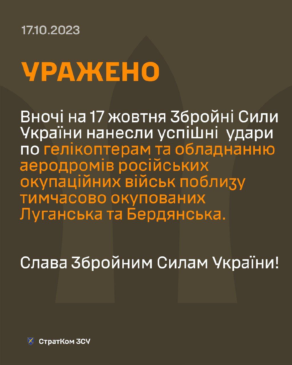 13.30 ЗСУ заявляють, що вночі знищили дев'ять російських гелікоптерів різних модифікацій на аеродромах у Бердянську та Луганську.