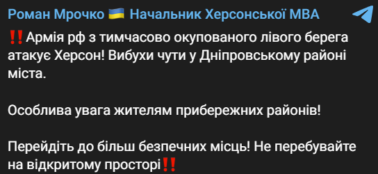 "Армія Росії з тимчасово окупованого лівого берега атакує Херсон! Вибухи чути у Дніпровському районі міста", - написав Мрочко.