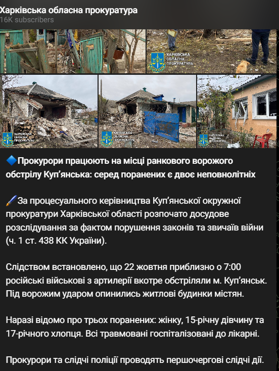 "22 жовтня приблизно о 7:00 російські військові з артилерії вкотре обстріляли м. Куп'янськ. Під ворожим ударом виявилися житлові будинки городян", - йдеться у повідомленні.