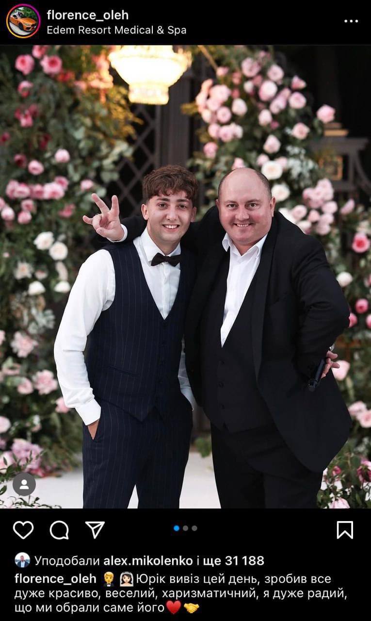 Ведучим був відомий комік студії "Квартал 95" Юрій Ткач (на одному з фото він із нареченим), який раніше потрапив у скандал, де його на вечірці за участю керівників прокуратури Житомирської області "присвятили" у лицарі. Пізніше Ткач у коментарі "Країні" стверджував, що відео було знято ще до вторгнення.