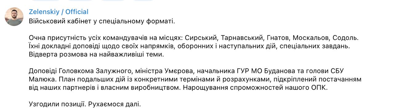 Доповідали головком Валерій Залужний, міністр оборони Рустем Умеров, начальник ГУР Кирило Буданов, голова СБУ Василь Малюк.