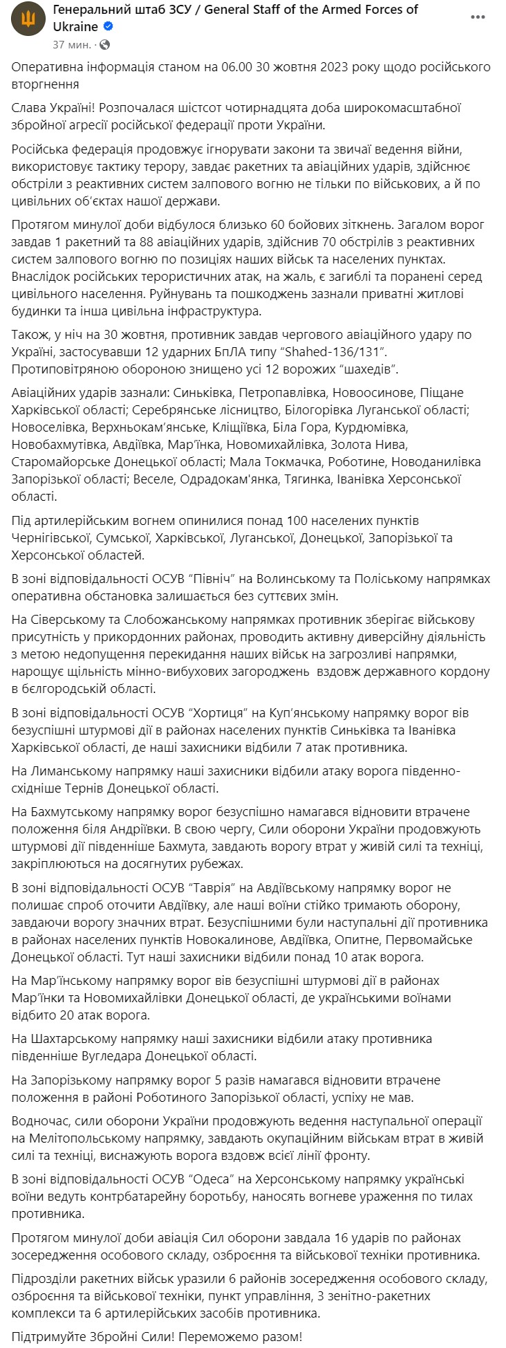 Війна в Україні триває вже 614-й день. Ми стежимо за останніми новинами та ключовими подіями 30 жовтня 2023 року в онлайні, що оновлюється.