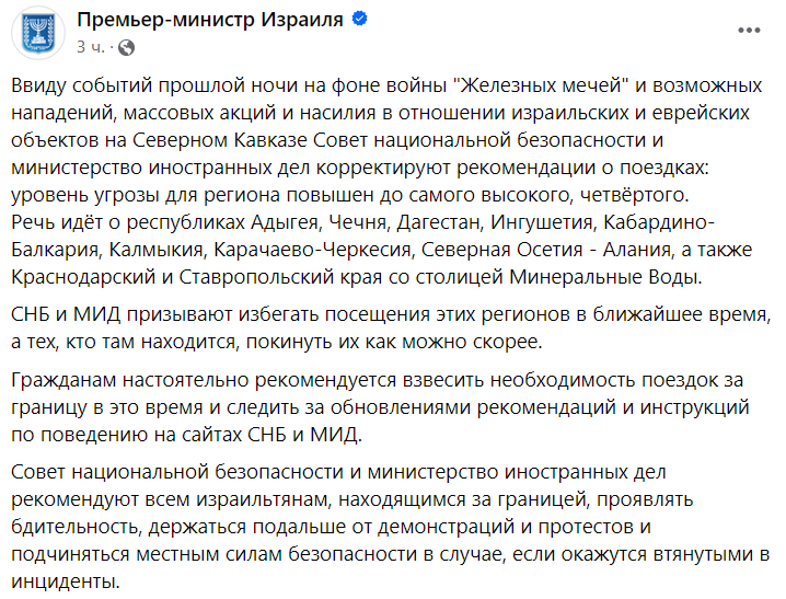 "Існують побоювання про можливі напади, а також масові та жорстокі протести щодо ізраїльтян і євреїв на Північному Кавказі в республіках: Адигея, Чечня, Дагестан, Інгушетія, Кабардино-Балкарія, Калмикія, Карачаєво-Черкесія, Північна Осетія- і Ставропольському краю. Громадянам Ізраїлю та євреям суворо рекомендується не відвідувати зазначені місця, а тим, хто перебуває там зараз - негайно покинути ці території", - також йдеться у повідомленні канцелярії прем'єр-міністра Ізраїлю Біньяміна Нетаньяху.