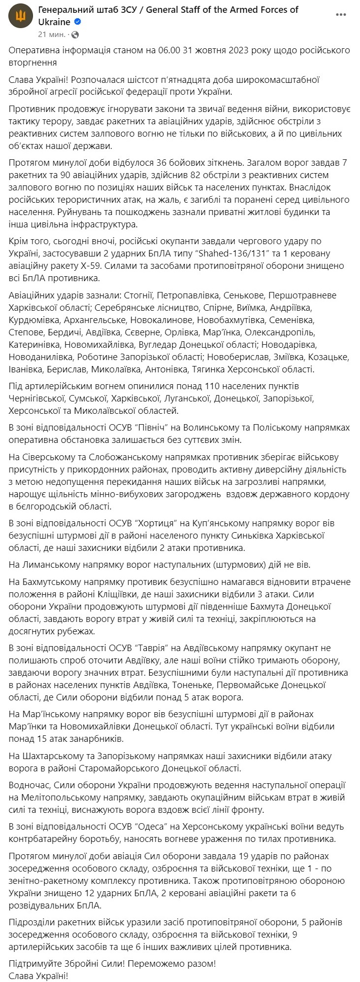 07:10 Минулої доби сталося 36 бойових зіткнень. Всього РФ завдала 7 ракетних та 90 авіаційних ударів, здійснила 82 обстріли з реактивних систем залпового вогню за позиціями наших військ та населених пунктів.