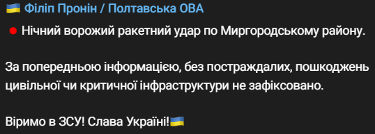 07:00 Сьогодні вночі російські війська атакували ракетами Миргородський район Полтавської області. Про це повідомив Глава ОВА Філіп Пронін.