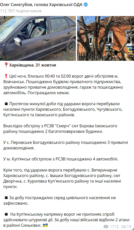 Про це повідомляє голова Харківської ОВ Олег Синегубов.