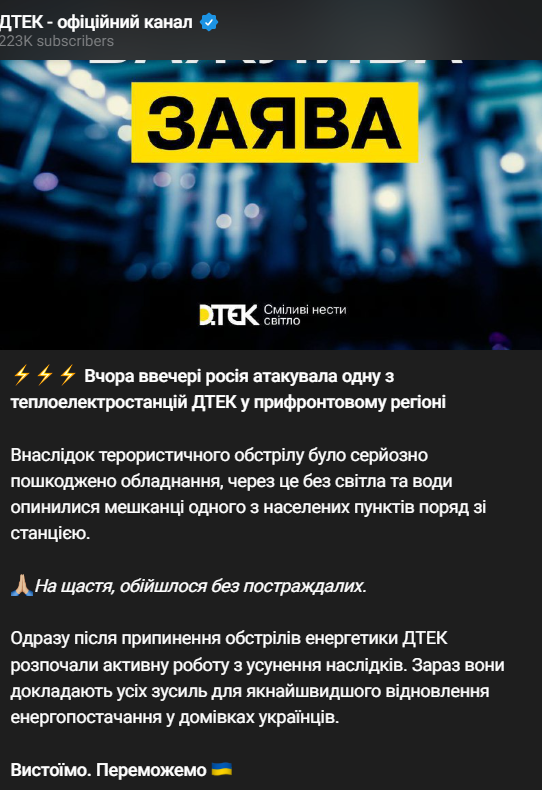 У ДПЕК повідомили, що Росія атакувала одну з теплоелектростанцій ДПЕК у прифронтовому регіоні.