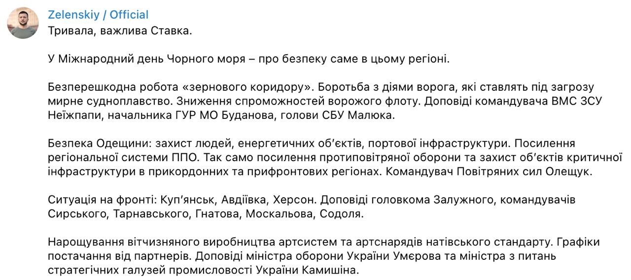 14:09 Президент України Володимир Зеленський повідомив про "тривалу" і "важливу" Ставку ВГК, на якій обговорювали ситуацію в Чорному морі.