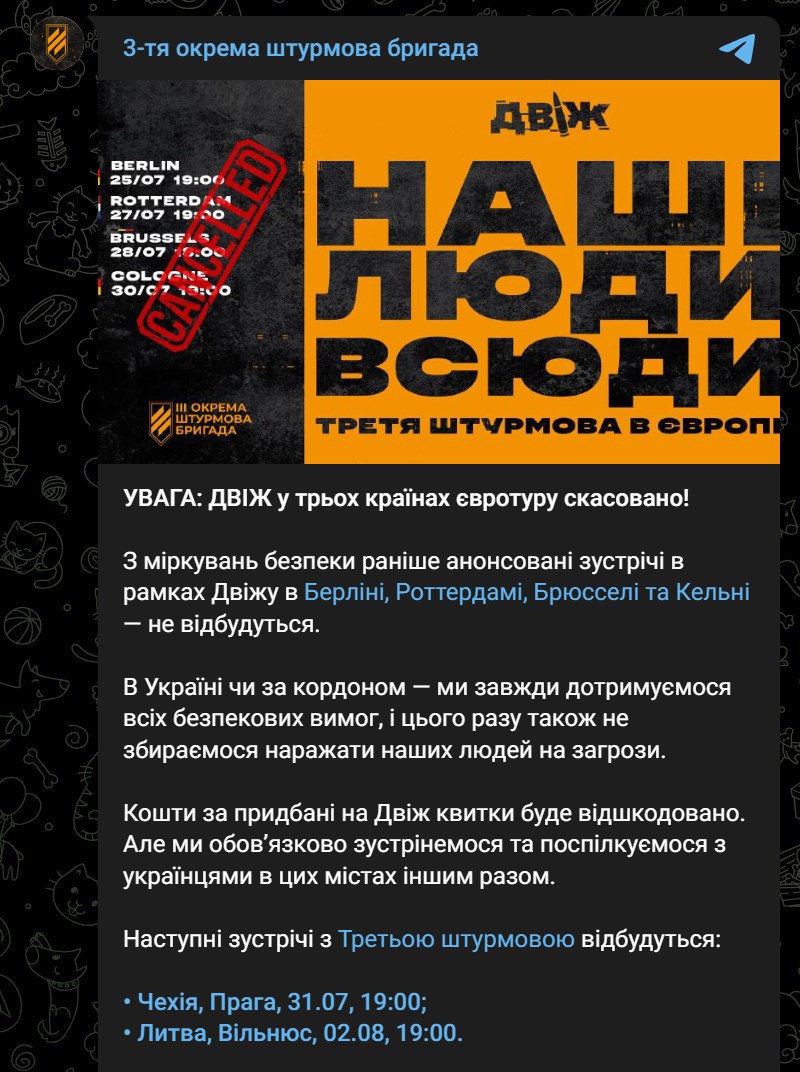 Після цього у 3-й штурмовій бригаді скасували заходи у Німеччині та Голландії, але анонсували, що наступного тижня проведуть їх у Празі та Вільнюсі.