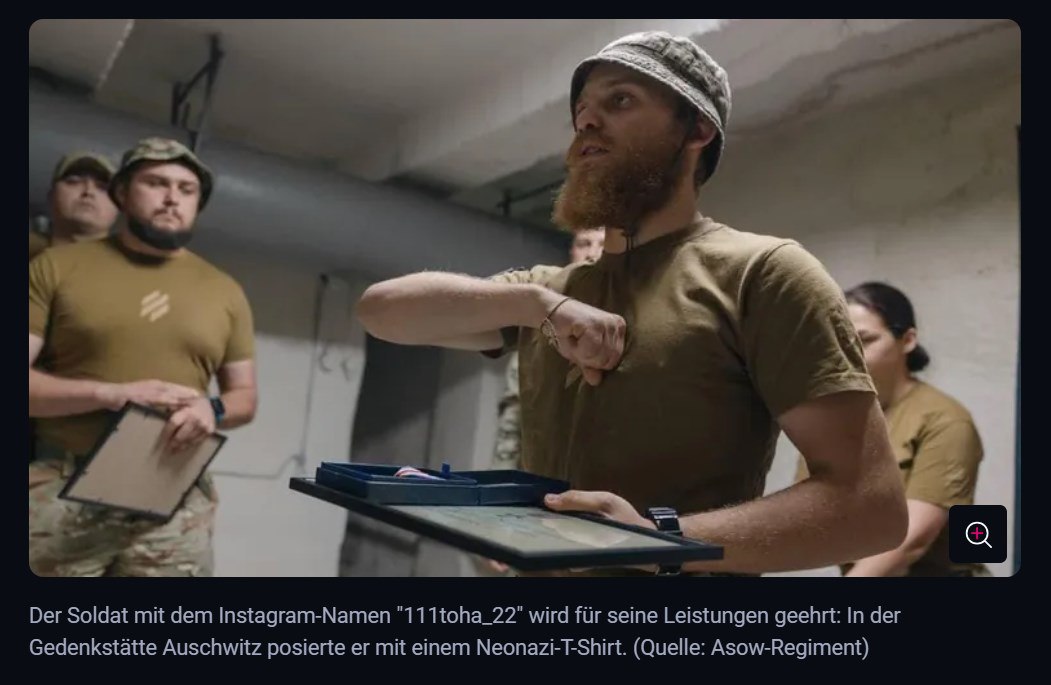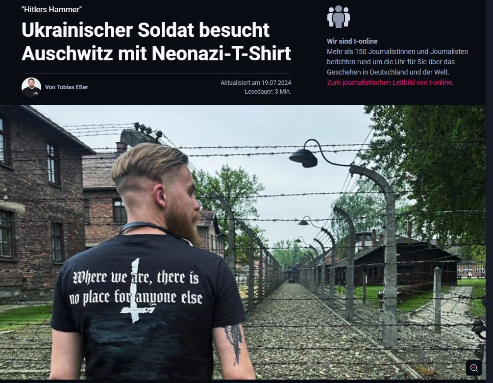 "Солдат, якого можна знайти в Instagram під ніком "111toha_22", відвідав колишній нацистський концтабір. Він був одягнений у футболку російської блек-метал-групи M8l8th (розшифровується ця назва як "Молот Гітлера", а її засновник Льовкін воює у складі Россійського корпусу на стороні України – Ред.). На звороті красується фраза "Там, де ми є, немає місця нікому іншому".