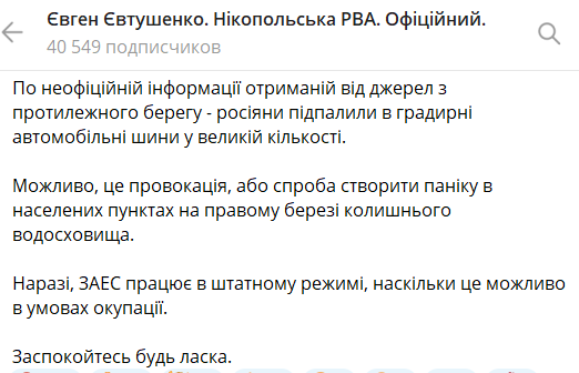 Голова Нікопольської районної військової адміністрації Євген Євтушенко заявив про пожежу на Запорізькій АЕС.