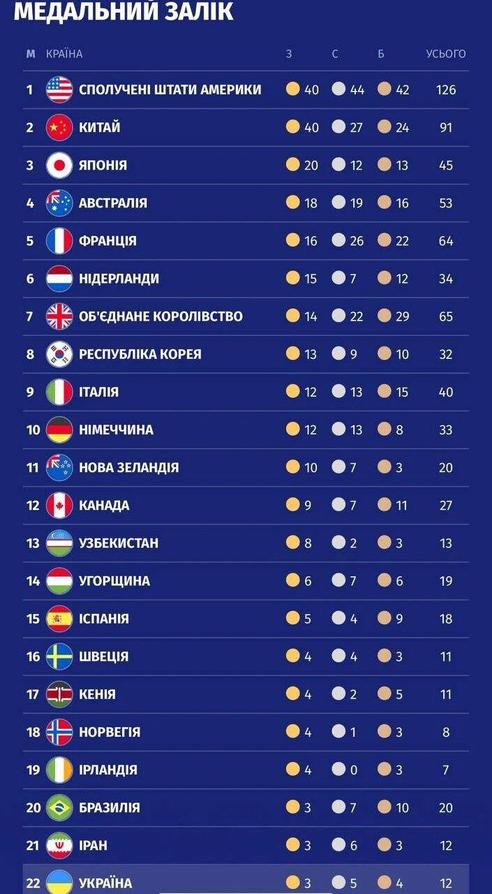 На другому місці опинилися збірна Китаю. В активі китайців 91 медаль (40, 27, 24).