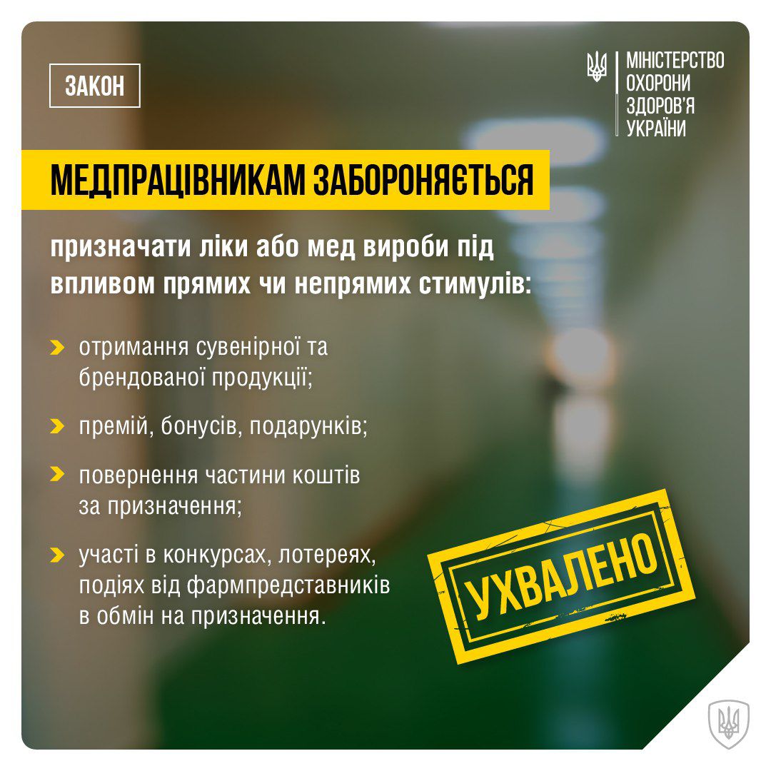 Верховна Рада України ухвалила закон, згідно з яким лікарям забороняється призначати препарати під впливом "фінансових стимулів" від фармацевтичних компаній.