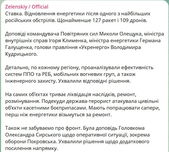 Про це він написав у своєму телеграм-каналі у повідомленні про засідання ставки верховного головнокомандувача.
