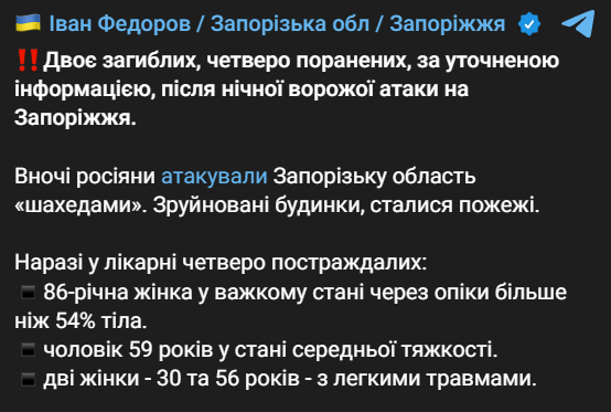 08:30 Вночі росіяни атакували Запорізьку область "Шахедами". Двоє людей загинули, ще четверо отримали поранення. Зруйновано будинки, сталися пожежі.