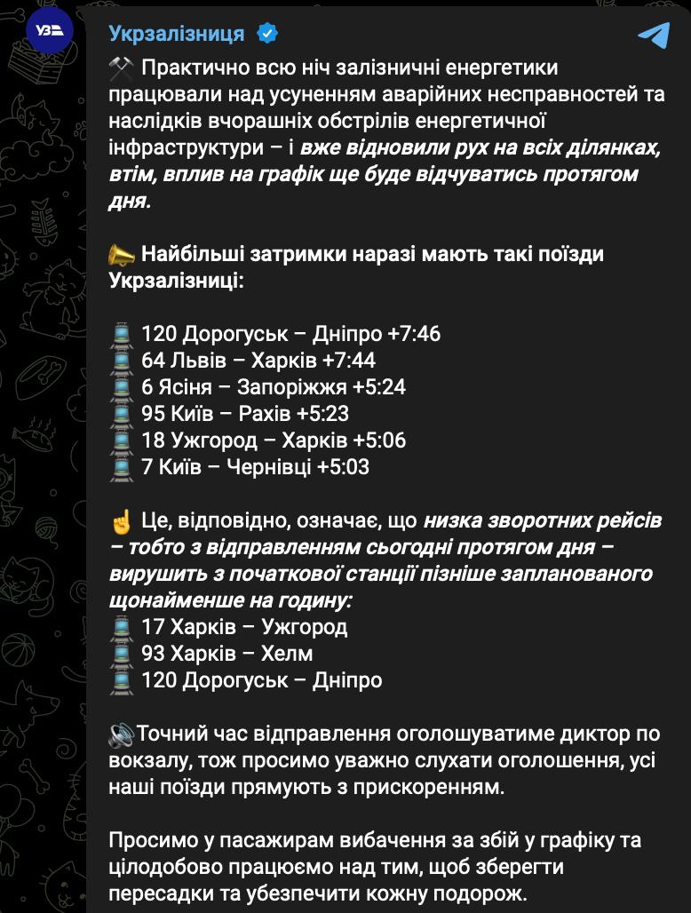 07:54 Багато поїздів "Укрзалізниці" через вчорашній ракетний удар все ще спізнюються.