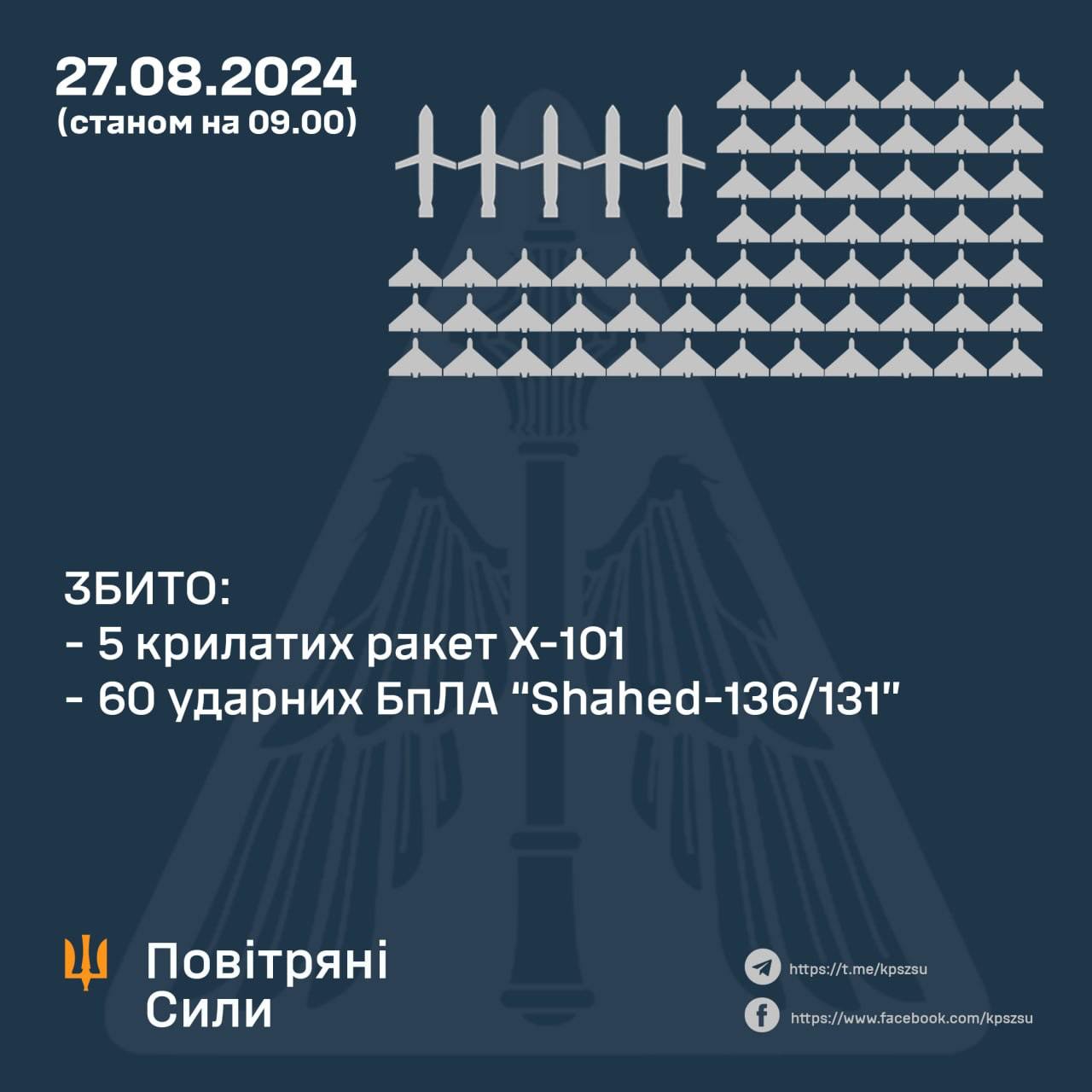 09:37 Повітряні сили повідомляють, що вночі збили 5 ракет із 10 та 60 "Шахедів" з 81.