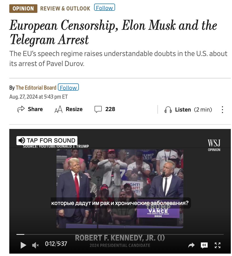 Також видання окремо випустило редакційну колонку на тему затримання Павла Дурова. У ній йдеться про "проблему цензури в Європі", що "викликає зрозумілі сумніви у США щодо арешту Павла Дурова".