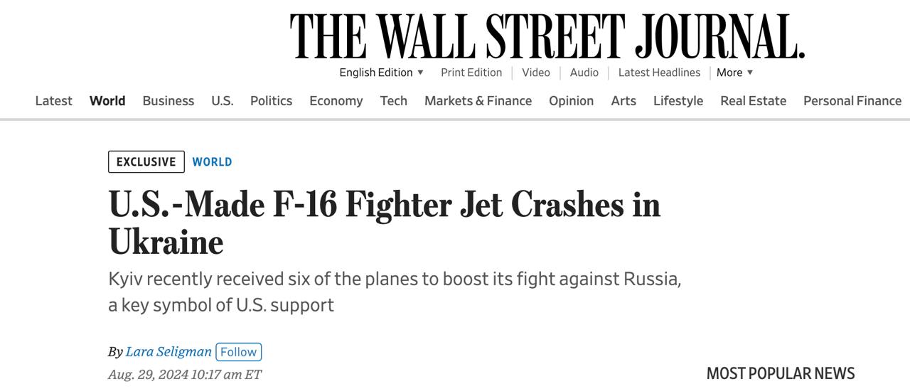 Один із шести переданих Україні винищувачів F-16 розбився під час ракетної атаки РФ у понеділок. Про це повідомило видання The Wall Street Journal із посиланням на офіційних представників США.
