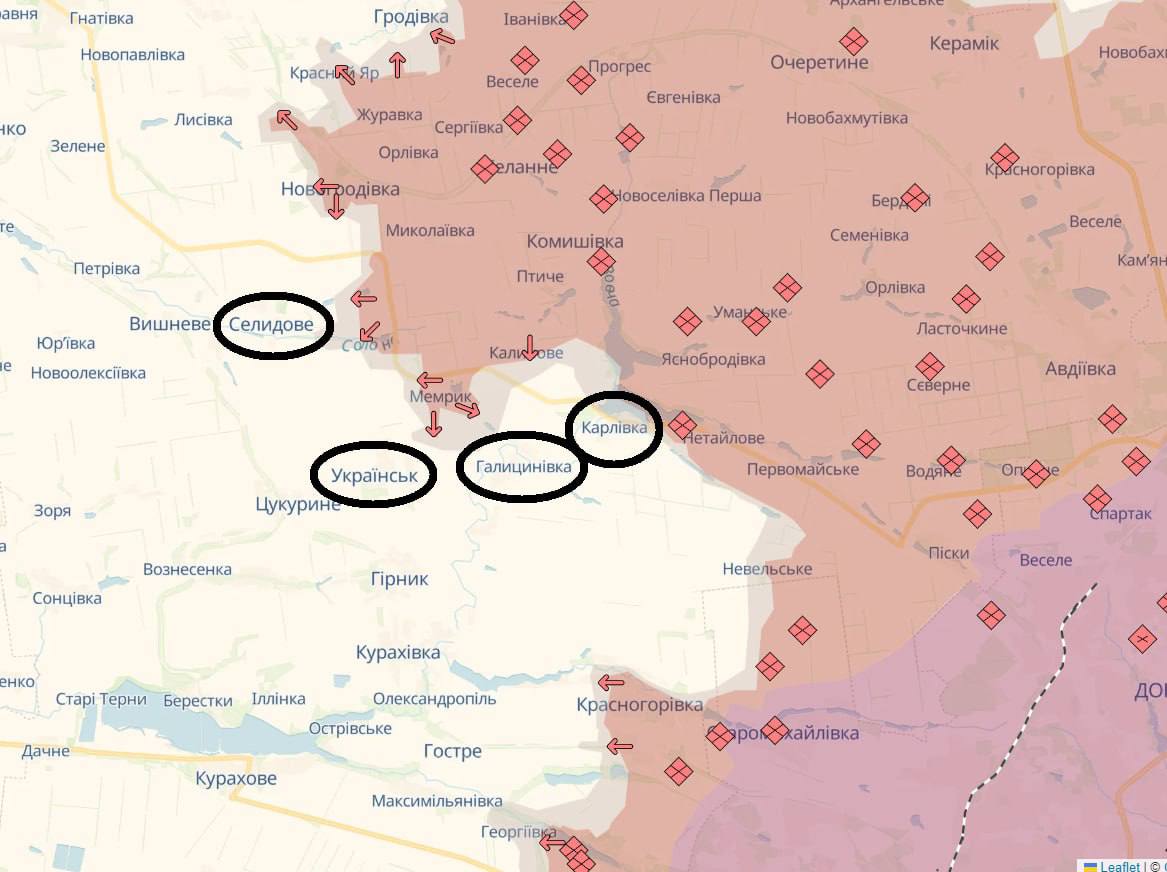 Загалом, як ми й передбачали в нашій статті про можливий задум російського командування на Покровському напрямку, армія РФ просувається через Новогродівку та Селідове на південний захід, обходячи з тилу (із заходу) потужну лінію зміцнень ЗСУ, які були збудовані на вищому західному. березі річки Вовча (з опорою на Українку та Гірник).