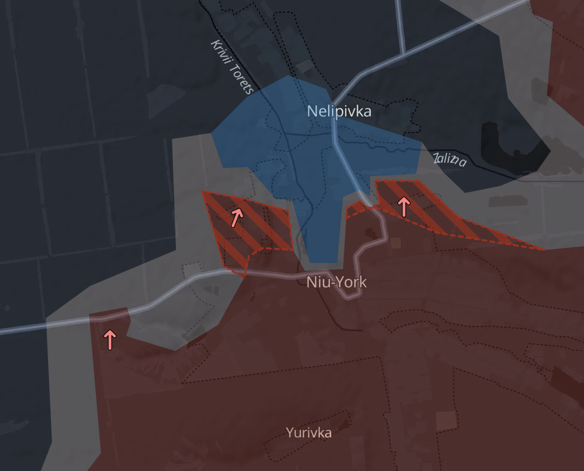 Карта Deep State підтверджує звільнення частини Нью-Йорка та Нелипівки. При цьому там відображено просування РФ флангами навколо селища. Російські паблики цього поки що не коментували та не підтверджували. Навпаки, вони пишуть, що росіяни мають просування в Торецьку і біля нього.