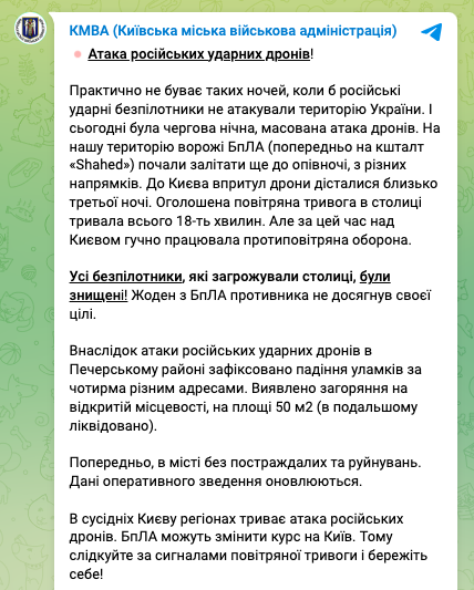Незважаючи на те, що нічна атака була масована, жоден із дронів не досяг своєї мети. Про це повідомили у Київській міській військовій адміністрації.