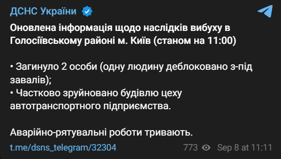 Сьогодні вранці у Голосіївському районі Києва на території автопідприємства стався вибух. Загинули двоє людей.