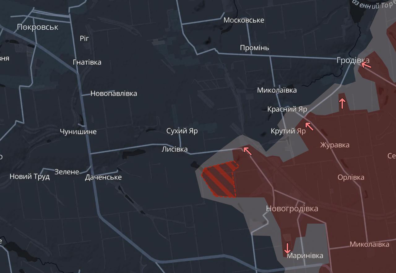 Також Deep State фіксує новий поступ на захід від Новогродівки - приблизно півтора кілометри у бік Лисівки. Це вже напрямок прямо на Покровськ (карта 3).