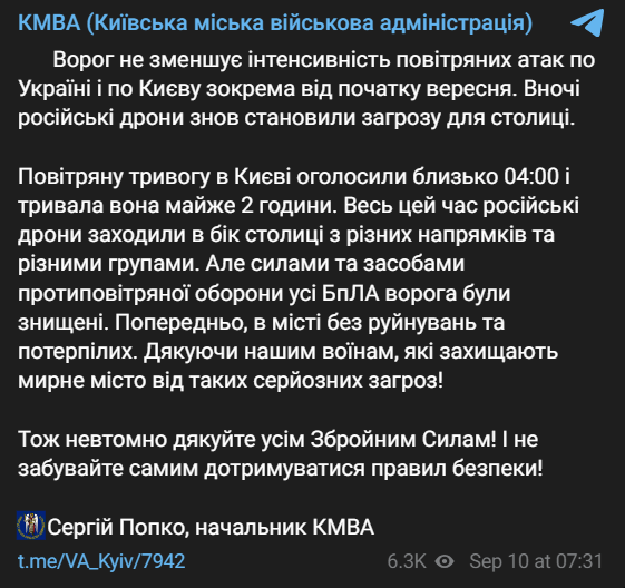 08:30 Сьогодні вночі росіяни атакували Київ ударними БПЛА. Про це повідомляє голова КДВА Сергій Попко.