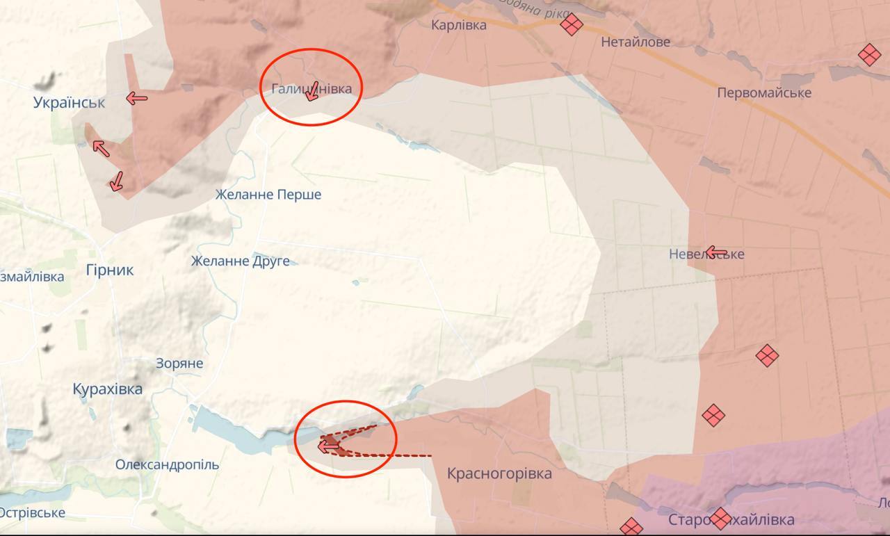 Про втрату Красногорівки на Курахівському напрямку українські військові говорили днями. На карті DS зазначено, що у РФ там за минулу добу був поступ, весь населений пункт знаходиться під контролем РФ або в сірій зоні.