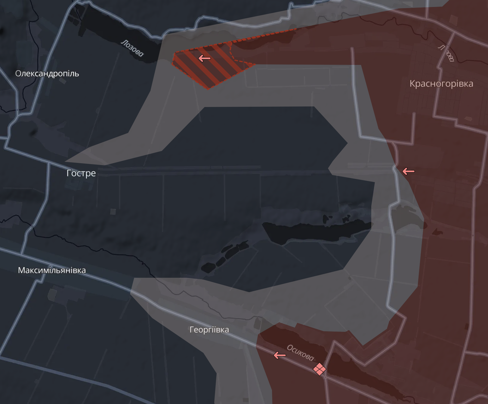 Про це пише паблік Deep State, підтверджуючи вчорашні заяви українських військових. Як ми вже писали, атака на Гострої ставить під загрозу укріпрайон ЗСУ у Георгіївці та Максиміліанівці, які прикривають зі сходу Курахове.