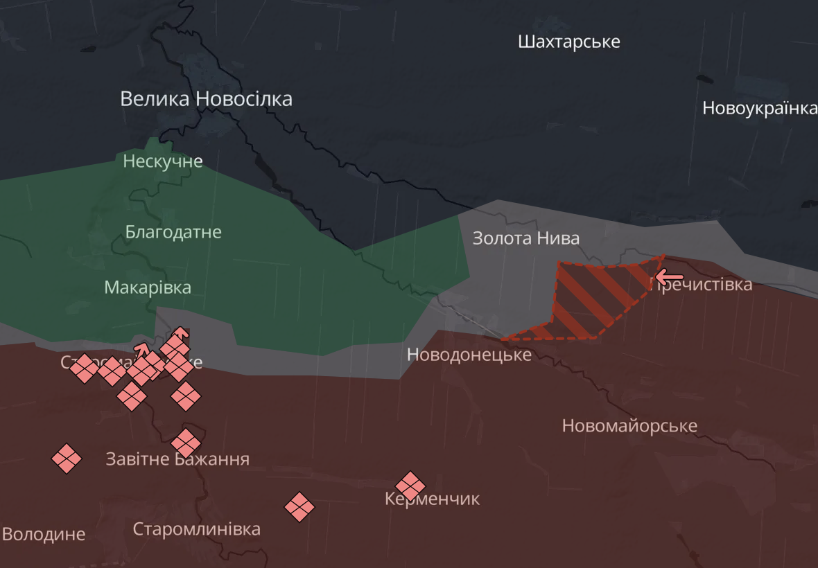Також у РФ значний поступ під Великою Новосілкою - у бік села Золота Нива з боку нещодавно захопленої Пречистівки. У Золотій Ниві тривають бойові дії.
