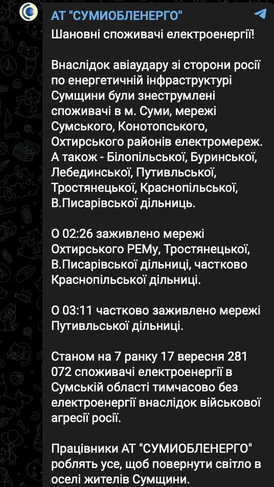 11:40 Світло у Сумах мають відновити до вечора, повідомляє Укренерго.