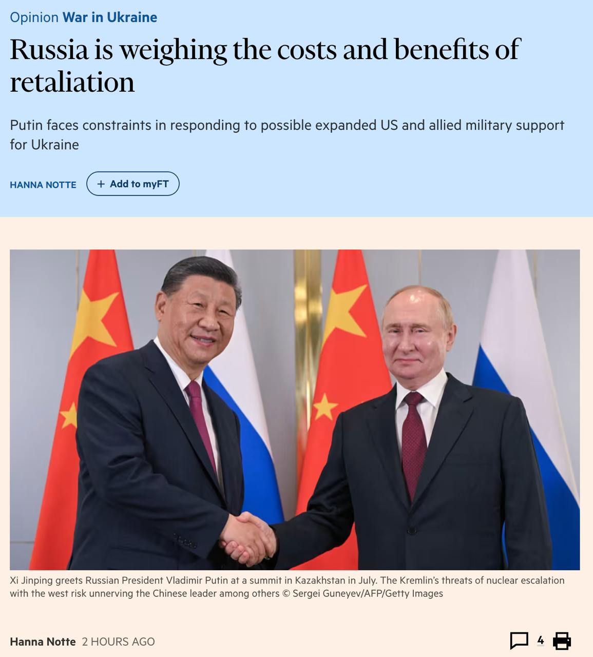 Тому, на думку FT, найімовірніше, що у разі надання Україні права далекобійних ударів по РФ Кремль піде шляхом ескалації відносин із Заходом, що не викликає сильного роздратування його союзників.Це можуть бути нові диверсійні, шпигунські та дезінформаційні операції в Європі, а також загроза ядерної війни, що може стривожити Китай і багато країн глобального Півдня, які не мають ядерної зброї.