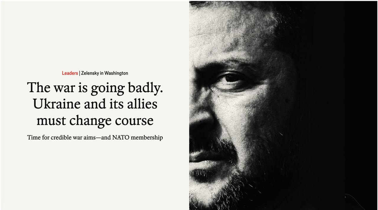 На думку видання, Україні потрібно "щось набагато амбітніше", ніж "план перемоги" Зеленського - "термінова зміна курсу", оскільки українські оборонні лінії "можуть впасти до того, як військові ресурси Росії будуть вичерпані". У той час як енергосистема вже значно знищена, втома Заходу зростає, а українське суспільство дедалі менше вірить у перспективу повної перемоги.