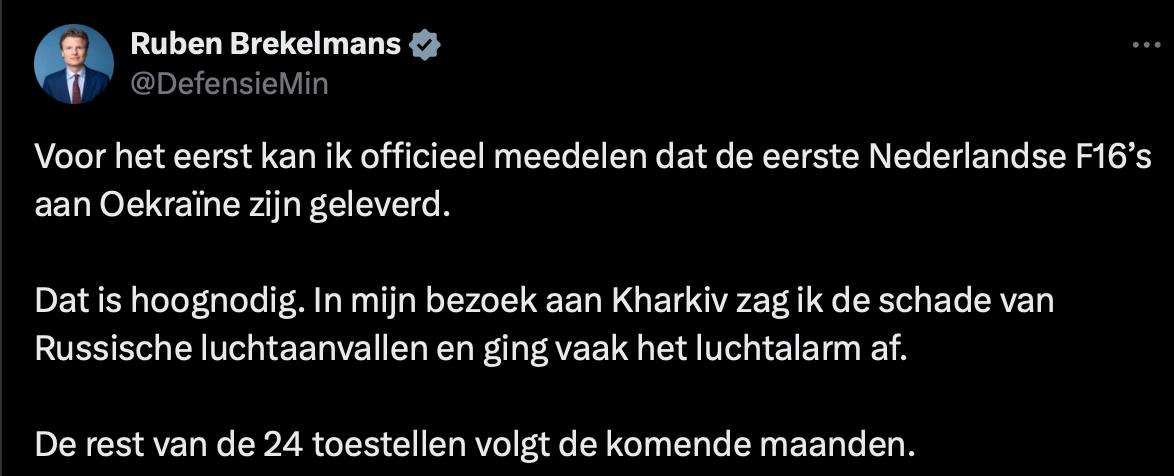 "Вперше можу офіційно заявити, що перших голландських F-16 доставлено в Україну... Інші 24 літаки надійдуть найближчими місяцями", - повідомив міністр у соцмережі X.