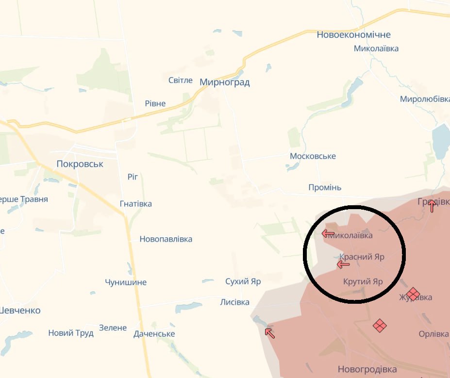 За інформацією українського військового паблику, йдеться про три населені пункти на Покровському напрямку – Червоному Яру, Миколаївці (північніший від Червоного Яру), Крутому Яру (на південь від Червоного Яру), а також про М'ясожарівку (Куп'янський напрям).