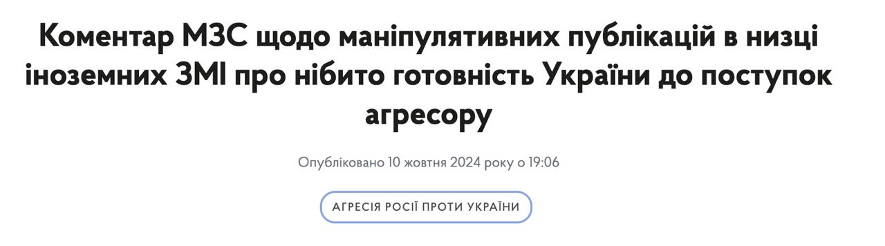 10:27 МЗС опублікувало спростування "маніпулятивних тверджень, озвучених у низці іноземних ЗМІ" щодо готовності України до заморозки війни лінією фронту в обмін на запрошення до НАТО або гарантії безпеки.